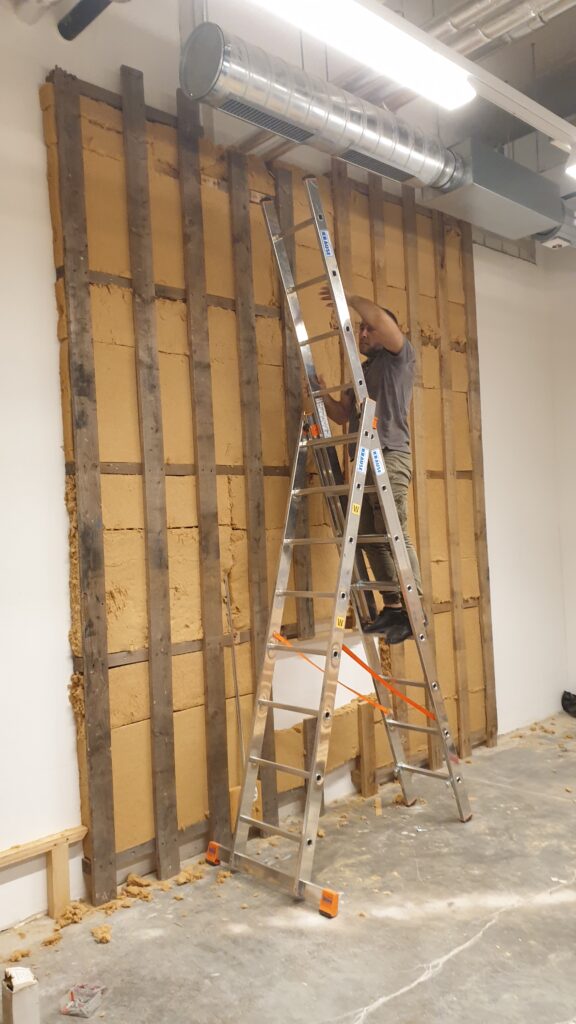 Als Unterkonstruktion montierten wir 4m lange Einwegpaletten direkt an die Wand.
