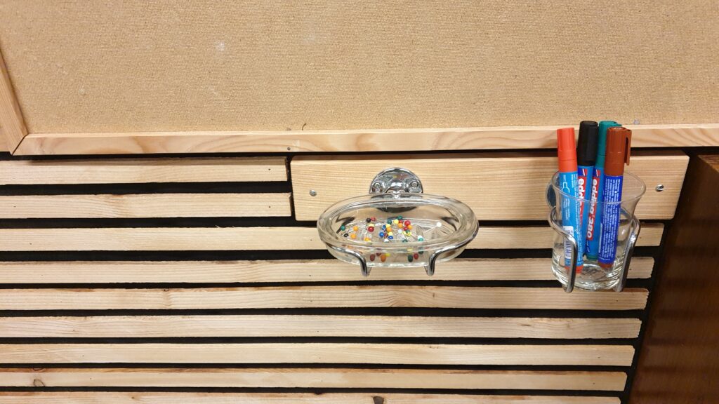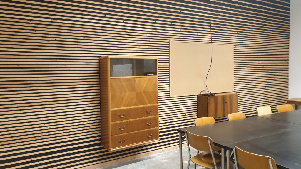 Unsere Wandverkleidung sorgt für bessere Akustik und ein angenehmeres Raumgefühl. Stauraum und Pinnwand inklusive.